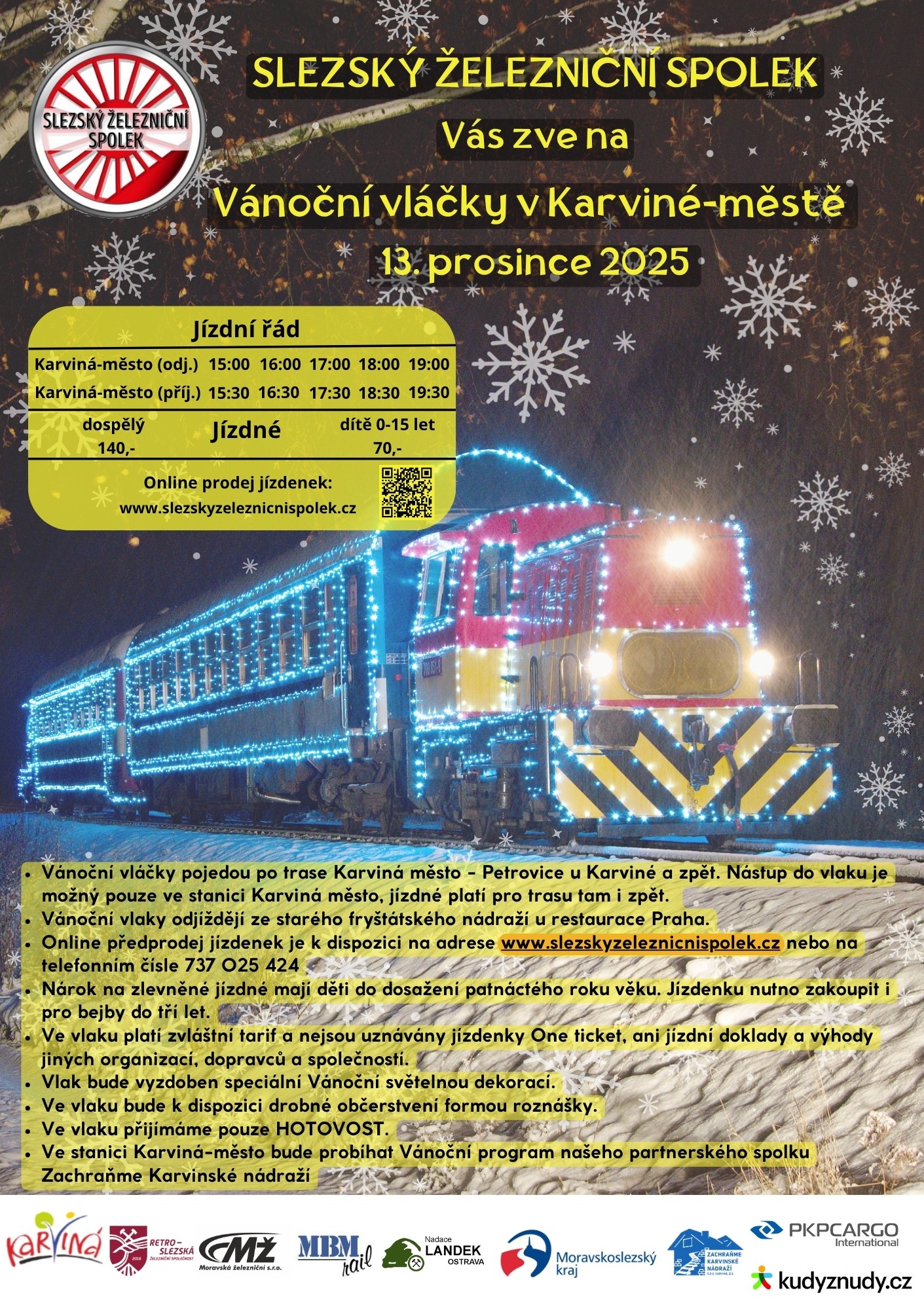 Jízdy Vánočních vláčků jsme pro Vás připravili díky finanční podpoře maistrátu města Karviné, krajského úřadu Moravskoslezského kraje a také díky podpoře všech našich parťáků a partnerů. Děkujeme! 🙂