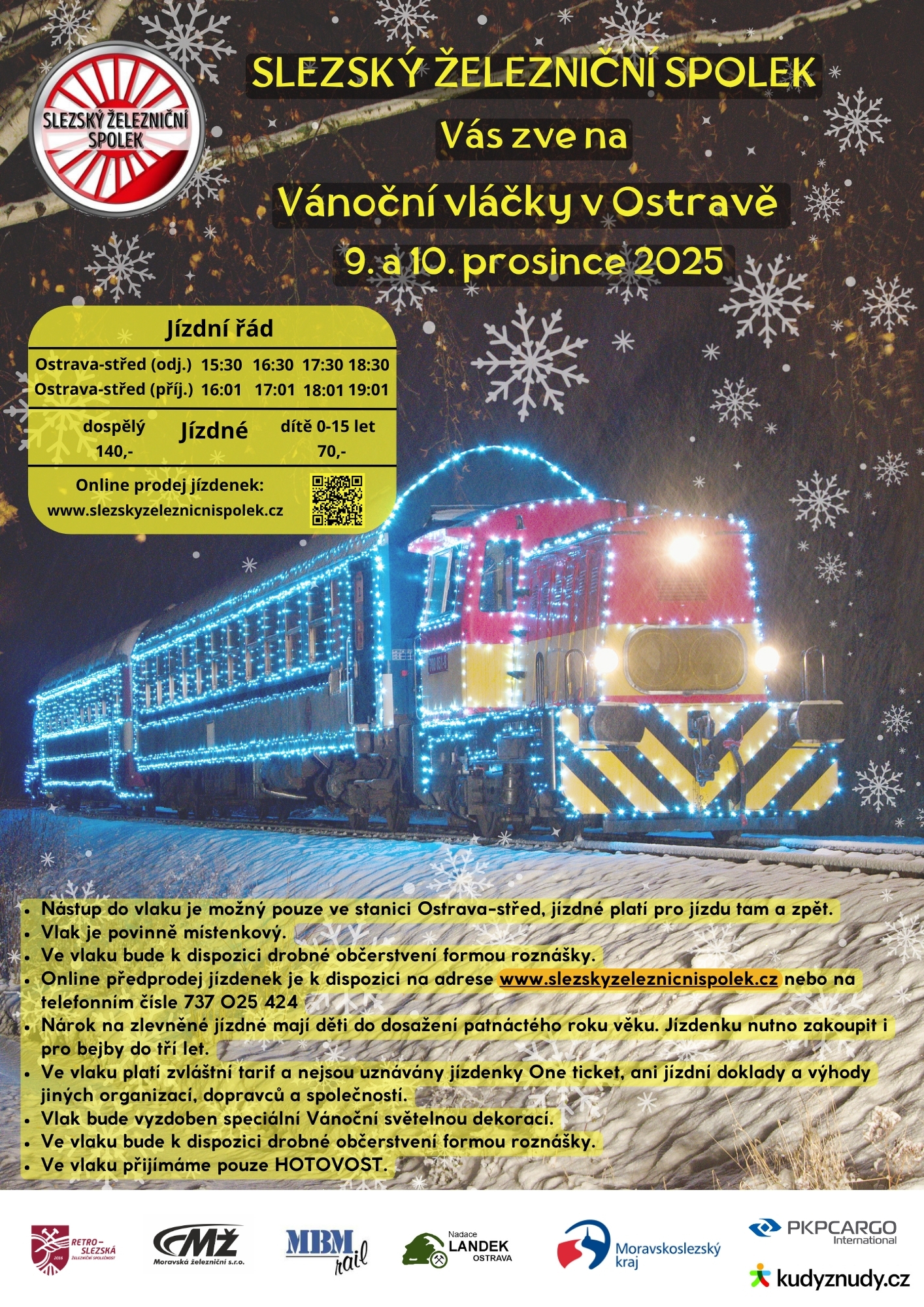 Speciálně vyzdobená Vánoční vlaková souprava bude jezdit z nádraží Ostrava střed v úterý a ve středu 9. a 10. prosince odpoledne v 15:30, 16:30, 17:30 a 18:30 na projížďku do Vratimova a zpátky.